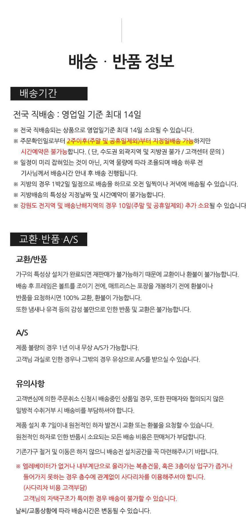 설치후 반품 불가 단, 초기불량제외 * 물류이동 중 취소 발생시 물류비 발생 함 (취소전 가능여부 확인 필수)